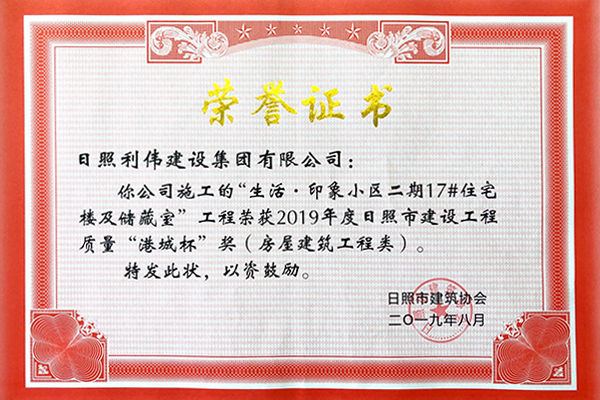 荣获日照市建设工程质量“港城杯”奖